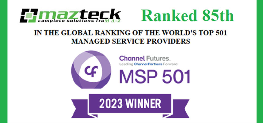 Mazteck has been named as one of the world’s premier managed service providers on the prestigious Channel Futures 2023 NextGen 101 rankings. Mazteck, a leading provider of cutting-edge managed services and technology solutions, proudly announces its remarkable achievement of securing the #85 position on the prestigious Channel Futures MSP 501 list for 2023. Mazteck's remarkable achievement underscores its unwavering commitment to excellence and establishes it as a prominent player in the industry.